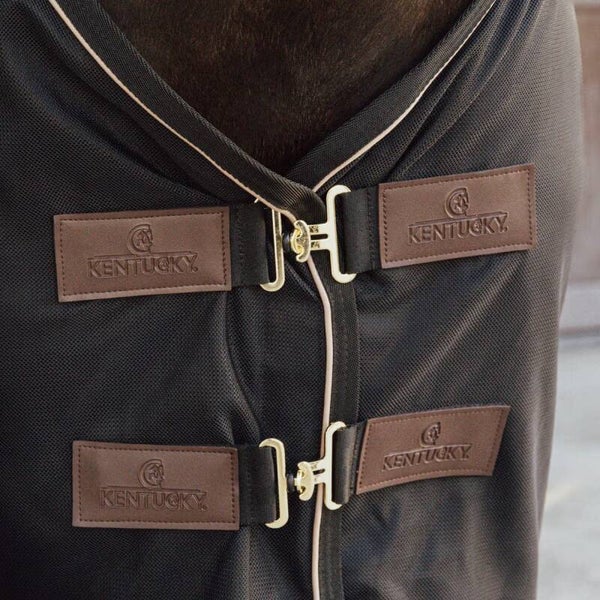 La couverture est anatomiquement façonnée au niveau du dos pour épouser parfaitement la forme du cheval. Pour plus de confort, nous avons ajouté un mouton synthétique au niveau du garrot. De plus, nous avons intégré le logo Kentucky en cuir végétal pour un aspect luxueux.