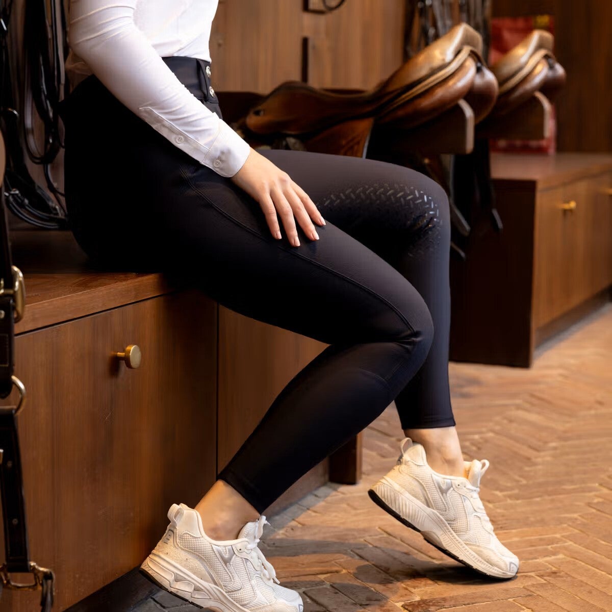 - Grip au genou – maintient la jambe tout en offrant une liberté de mouvement optimale en selle